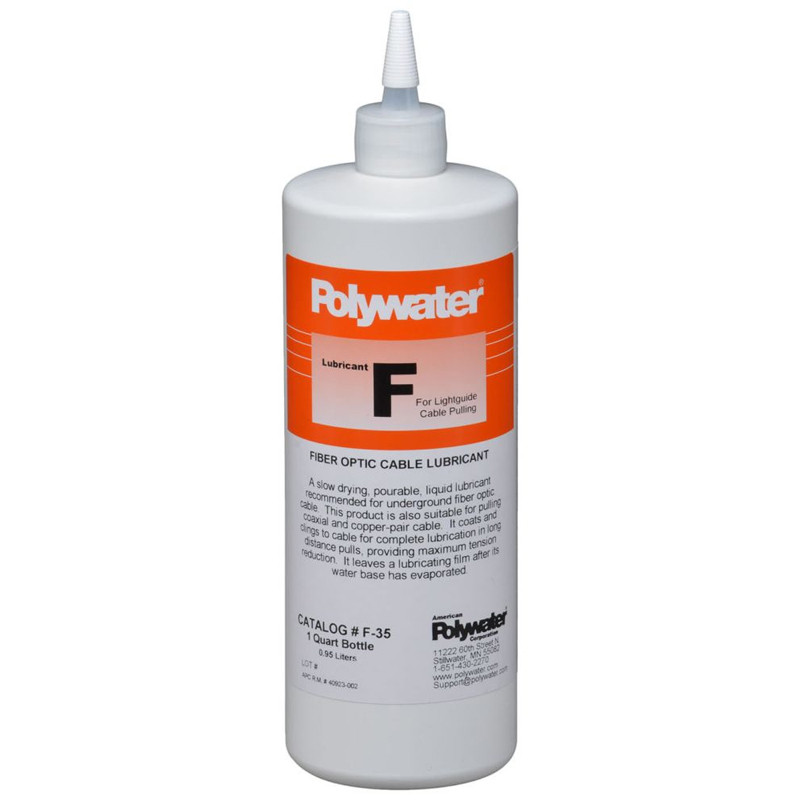Polywater® F Lubricant is for pulling underground fiber optic cable and copper-pair cable, which require low tension pulling. The pourable liquid formula of this long-distance cable-pulling lubricant wets and clings to cables and evenly coats the jacket surface to greatly reduce friction on longer-distance pulls.